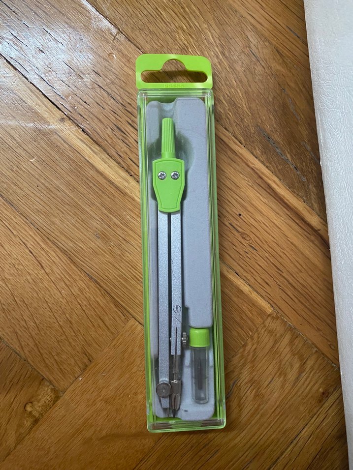 Yeşil renkte, hassas daire çizimi için pergeli ve yedek uç kutusunu içeren set. ️