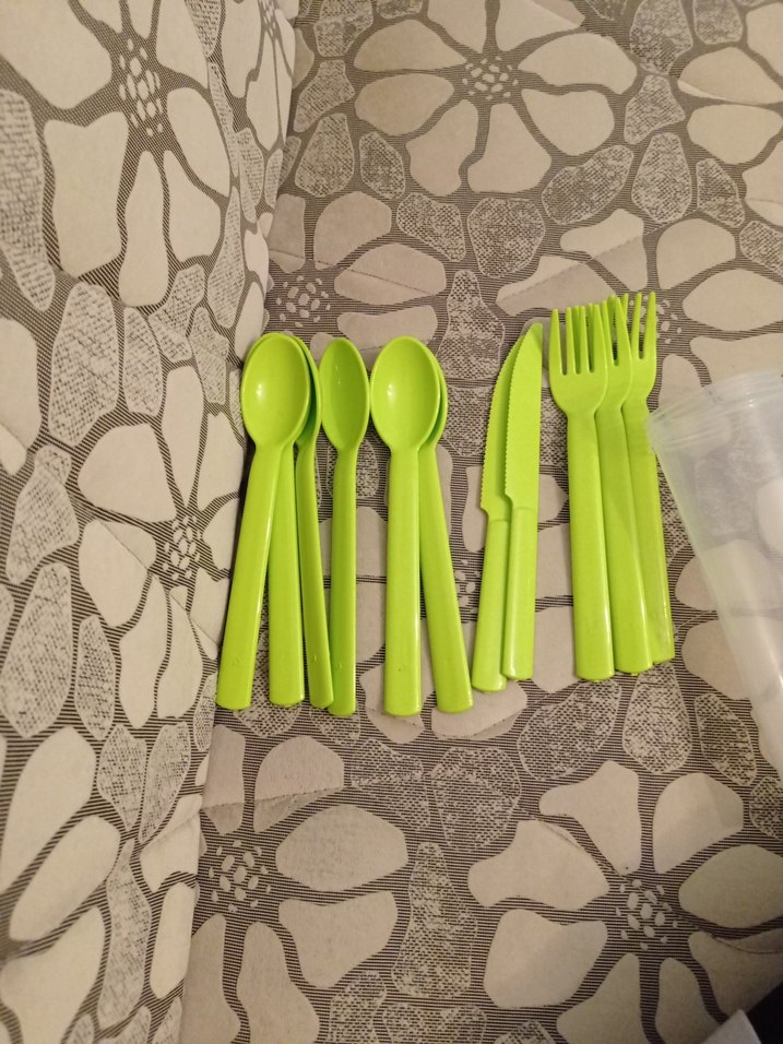 Yeşil renkli plastikten yapılmış çatal, kaşık ve bıçak seti, canlı renklidir ve günlük kullanım için uygundur.