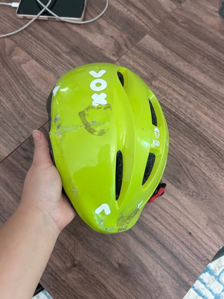 Yeşil renkli, renkli baskılı desenli ve cırt cırtlı bantlı, kauçuk malzemeden yapılmış grunge punk tarzı bisiklet paten kaskı .darbeleri var iç kısmında hiç bir sıkıntı yol çok güzel bir kask ama dışında oğlum etiket yapıştırmış