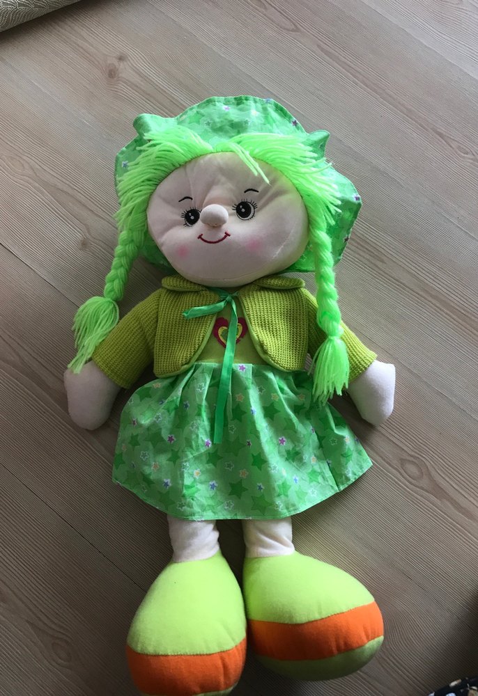 Canlı yeşil örgülü saçlara sahip bebek oyuncak, yeşil elbise ve hırka giymiş, yumuşak kumaş ve büyük ayakkabılarla.