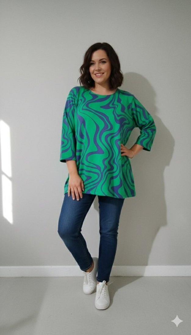 Yeşil renkli hamile tunik, salaş kesim ve uzun kolludur. Canlı bağlama desenli, drapeli ve yuvarlak yakalıdır. Midi boyda, yumuşak sentetik kumaştan üretilmiştir.