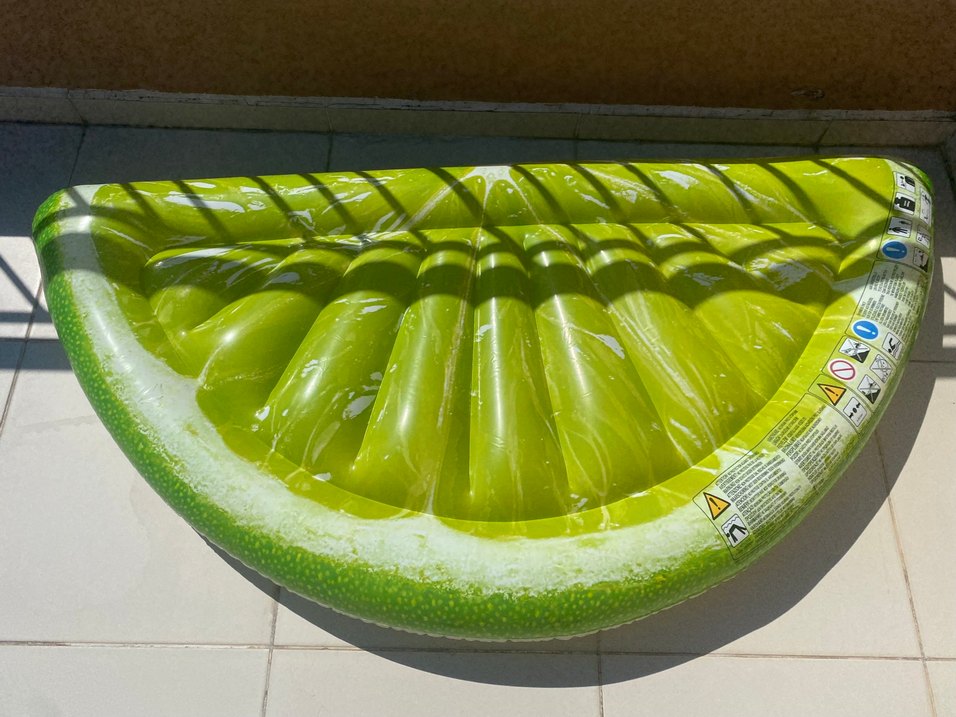 Renkli yeşil şişme su oyuncağı, meyve dilimi şeklindedir ve havuzda veya plajda eğlence için uygundur. Şişme deniz yatağı hiç kullanılmadı aklınızda bir fiyat varsa lütfen yazın