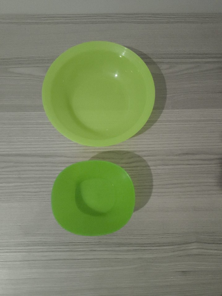 Yeşil renkte, parlak ve pürüzsüz malzemeden yapılmış tabak ve kase takımıdır. ️