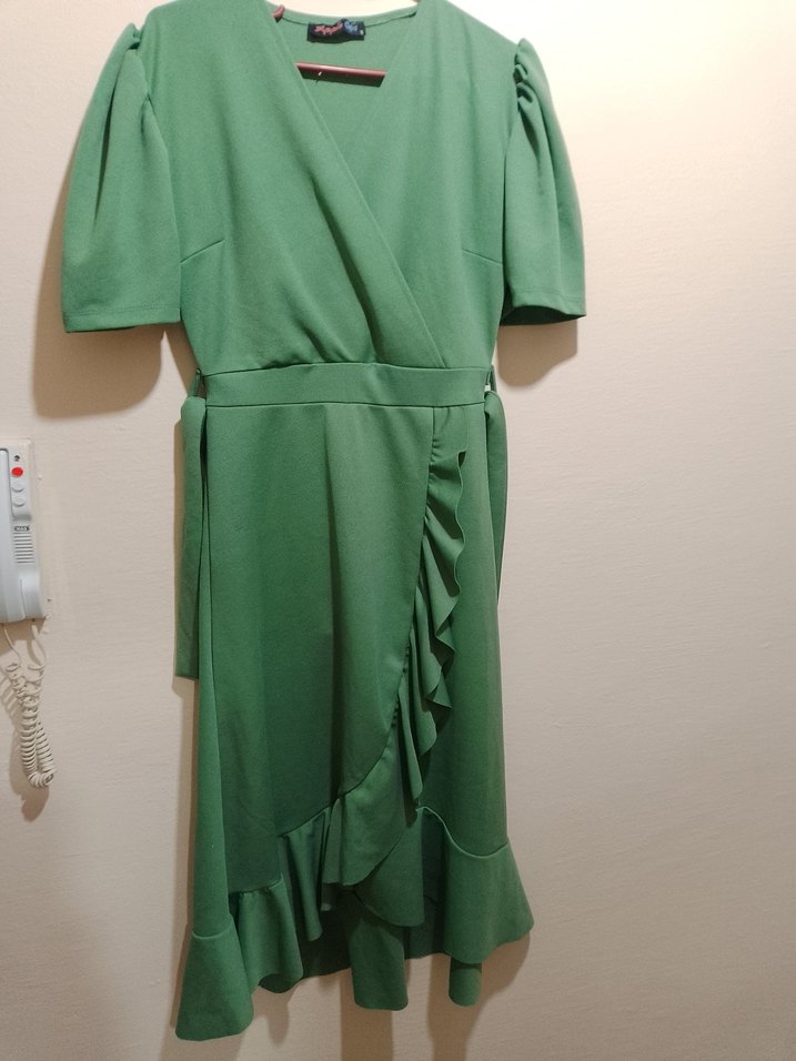 Açık yeşil renk, uzun boy, fırfırlı detaylı, kısa kollu ve V yakalı kadın elbisesi. hiçbir defosu yoktur