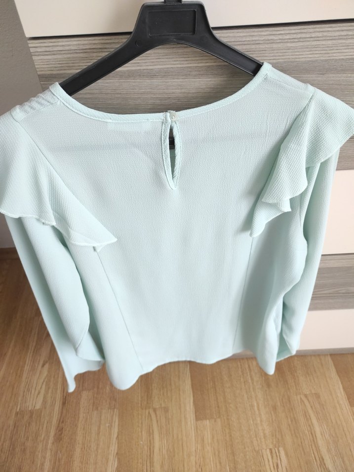 yeşil renkli, yuvarlak yakalı ve uzun kollu, fırfır detaylı kadın bluzudur. Rahat kesim ve kısa boydadır, yumuşak sentetik kumaştan üretilmiştir.