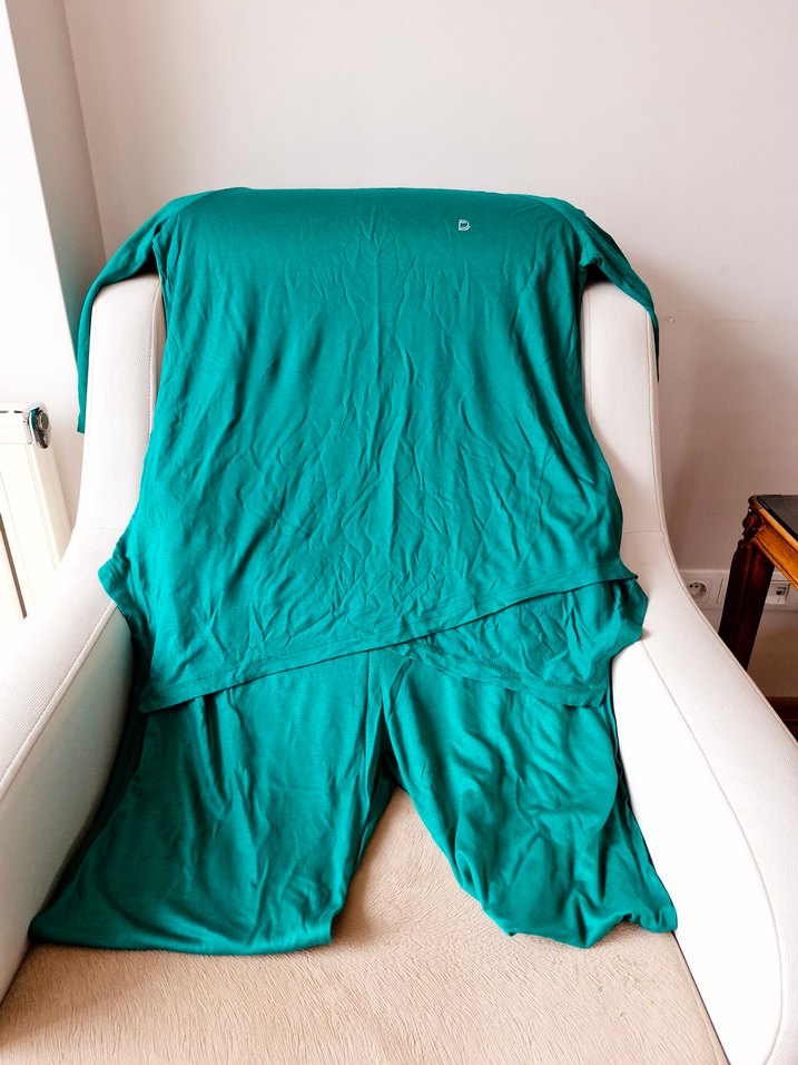 Dagi marka yeşil parlak renkte, Truvakar kollu dirsekten aşağı midi boy, pijamanın etek kısımları asimetrik geliyor bol kesim 46 beden pijama takımı. pijama altında iki cep bulunmaktadır Desensiz ve rahat tasarım. resimde Turkuaz çıkmış ama pijamanın orijinali yeşil pijamanın ölçüleri pijama boyu 70 santim en koltuk altından 56 santim karın ve göbek kısmı 60 santim kol boyu 52 santim çok çok yumuşak dokulu hamile ve lohusaların da rahatlıkla giyebilecekleri bir pijama alt kısmı boy 105 santim kalça 56 belden Ağa kadar 32 santim