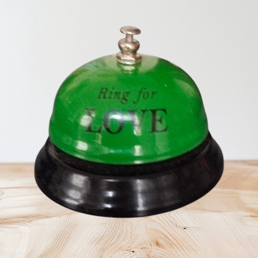 Renkli yeşil tasarıma sahip, vintage tarzda resepsiyon zili "Ring for LOVE" yazısı, nostaljik bir hava katıyor.