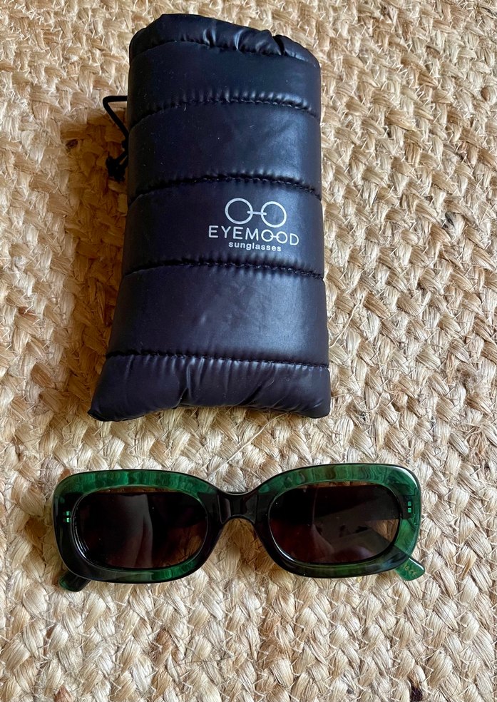 Yeşil renkli, koyu çerçeveli retro tarzı kadın güneş gözlüğü. Siyah, dolgun EYEMOOD koruyucu kılıf ile birlikte. ️