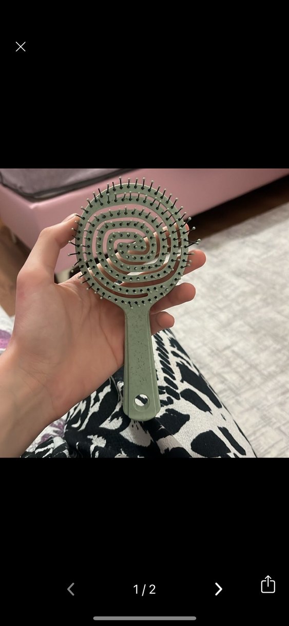 Yeşil renkli saç fırçası, spiral desenli yapısıyla saçları nazikçe açar. Ergonomik sapı rahat tutuş sağlar.