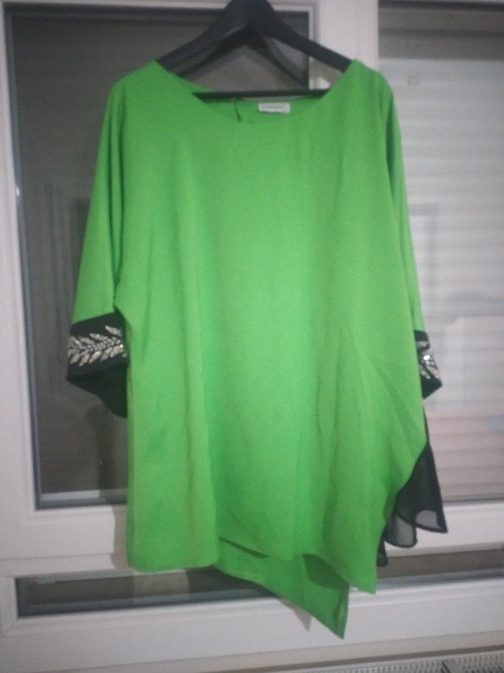 Yeşil renkli, uzun kollu, yuvarlak yakalı, bol kesim abiye tunik Asimetrik midi boyda, parlak kumaştan ve drapeli tasarıma sahip.