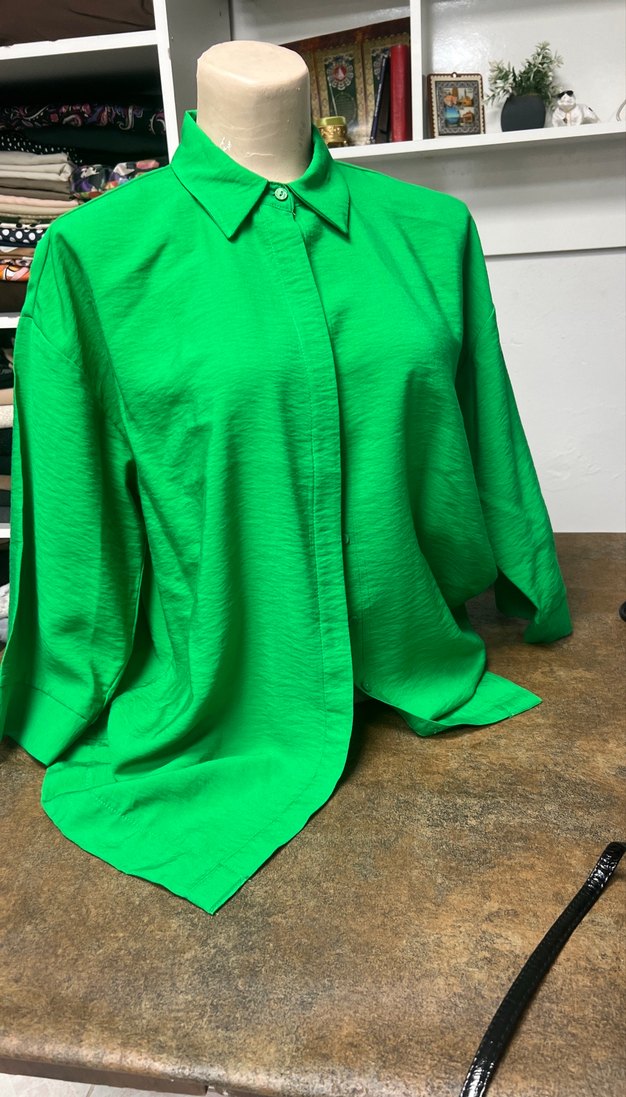 Yeşil renkli kadın keten gömlek, salaş kesim ve uzun kolludur. Drapeli tasarımı ve parlak dokusuyla ofis ve sokak stiline uygundur. ✨