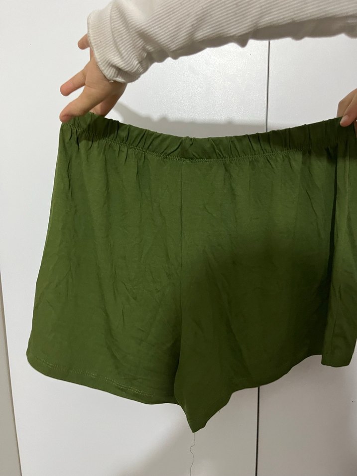 Salaş kesim, parlak yeşil keten kumaştan yapılmış, rahat ve şık hamile şortu.