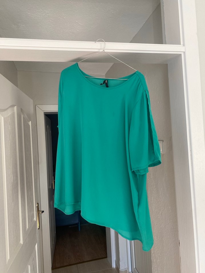 Yeşil rengi, kısa kollu ve yuvarlak yaka olan bu bluz, salaş kesimi detayıyla dikkat çeker. İpeksi dokusuyla minimal ve rahat bir stil sunar. kolları yırtmaç detaylı