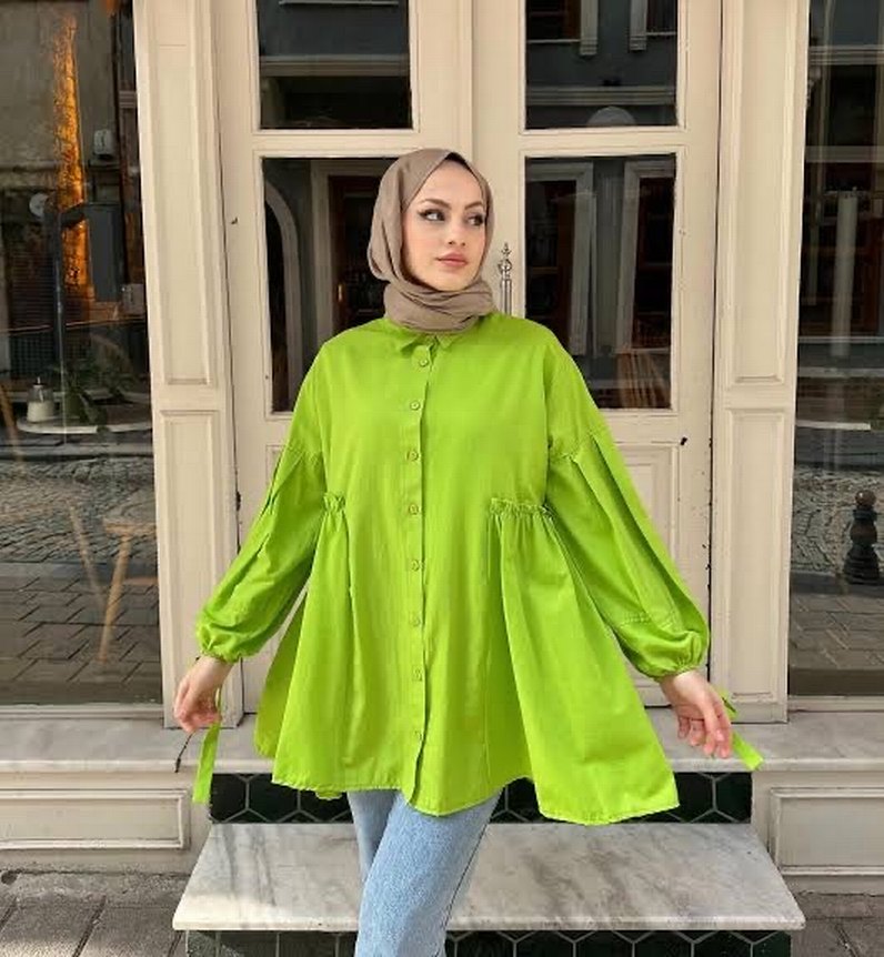 Salaş kesim, uzun kollu yeşil midi tunik, parlak sentetik kumaş ve hafif batik desenli, yüksek yakalı rahat bir model.