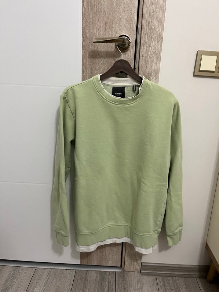 Yeşil renkli, yuvarlak yaka ve uzun kollu, yumuşak ve sıcak kumaştan yapılmış salaş kesim sweatshirt. Günlük sokak stiline uygundur.