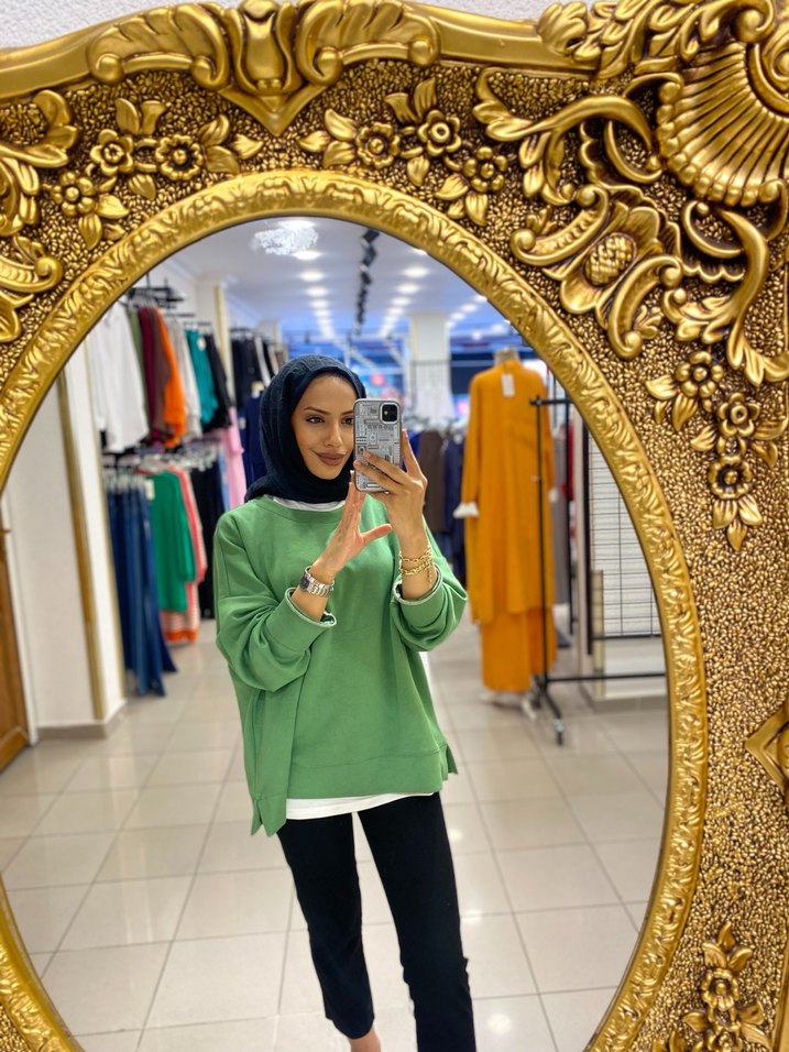 Yumuşak pamuk kumaştan, bağlama desenli ve salaş kesim yeşil sweatshirt. Uzun kollu, bisiklet yaka, günlük rahat stil için uygun.