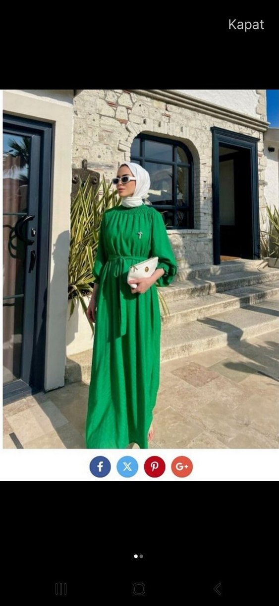 Yeşil renkte, salaş kesim ve drapeli uzun elbise. Uzun kollu, yüksek yakalı ve hafif batik desenlidir. Günlük kullanım için sentetik kumaştan üretilmiştir.