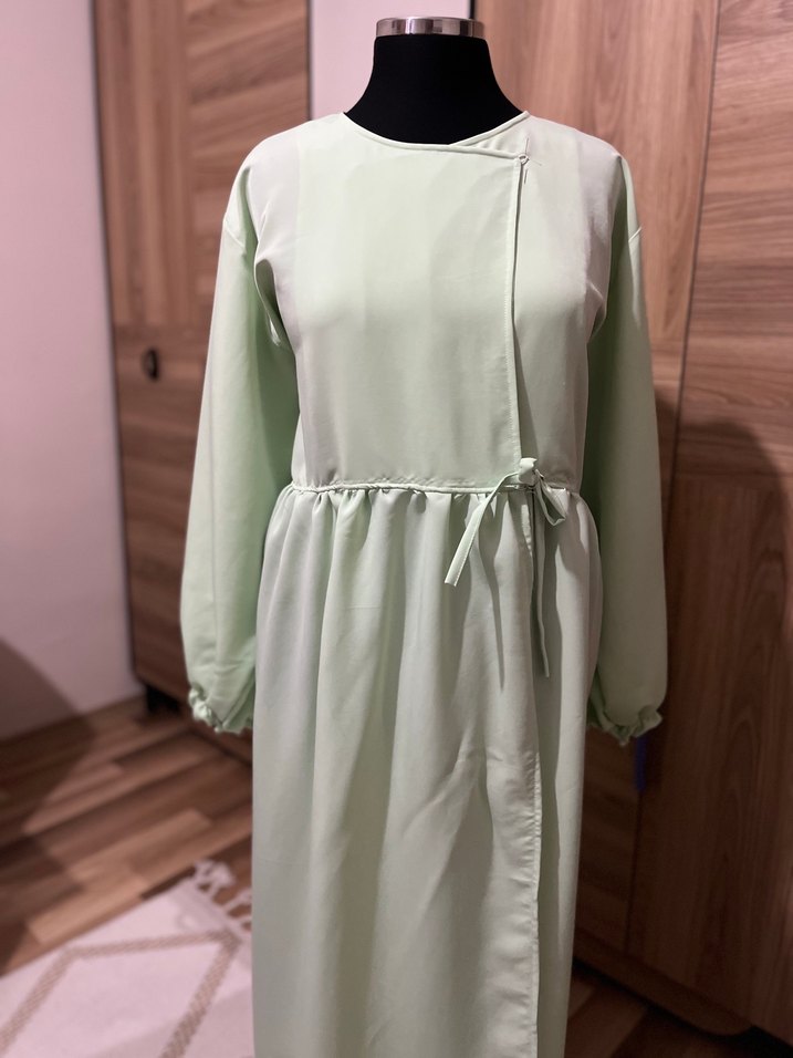 Ürün sıfır Etiketli ürün 64-66 bedene uyumlu Boyu 140 cm İki kol arası 86cm Çağla yeşili kumaş Krep kumaş Pastel yeşil renkte, salaş kesim uzun kollu ve yuvarlak yakalı elbise. Belde bağlama detaylı drapeli tasarıma sahip, yumuşak sentetik kumaştan üretilmiştir. Günlük kullanım için uygundur.
