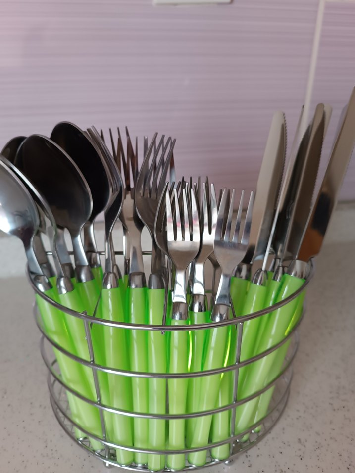 Çatal, bıçak ve kaşıklardan oluşan, açık yeşil saplı ve metal tutucuda düzenlenmiş bir çatal bıçak seti.ürün çok az kullanıldı belirli büyük bir sıkıntısı yok,sadece bazılarında alt kısımlarında hafif çatlaklar var ama kullanıma engel değildir.görsellere ekledim bakabilirsiniz
