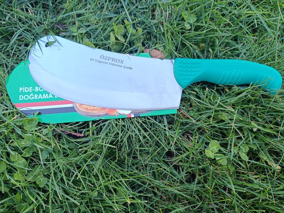 Yeşil saplı, el yapımı dövme çelikten üretilmiş OZPROX marka mutfak bıçağıdır. Keskin ve dayanıklıdır.