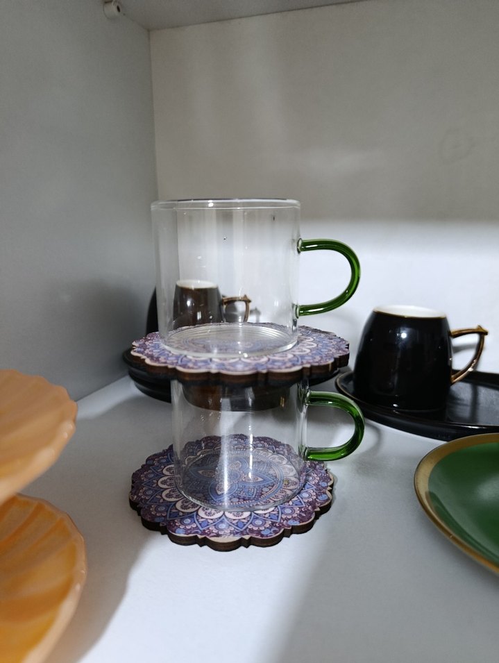 Yeşil saplı şeffaf cam kupalar, koyu mor desenli altlıklar bir kaç kez kullanıldı temiz urun