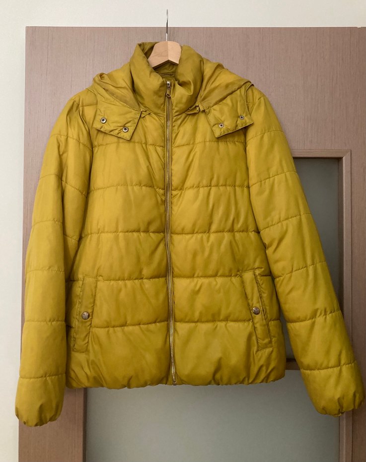Çok iyi durumdadır. Fermuarlı, yeşil sarı arası bir renk , normal boyda, uzun kollu ve kapüşon detaylı kadın kışlık mont. Boy. 68 cm . Arkası lastik detaylı olduğu için 5.- 6 cm daha esneyebiliyor , hiçbir defosu yoktur..