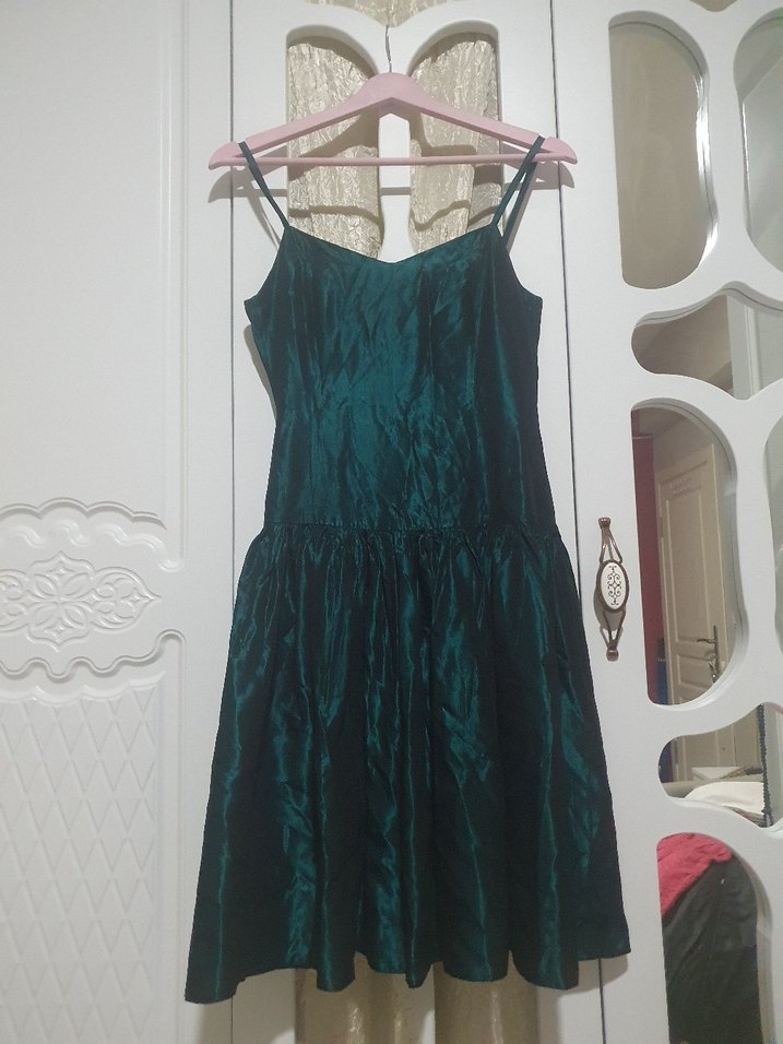 Fitted kesim, koyu yeşil renkli bu abiye elbise, ince askılı, straplez yakalı ve pilili midi etekli, şık bir parti görünümü sunar.utulenmesi gerekli 1 kere giyildi .