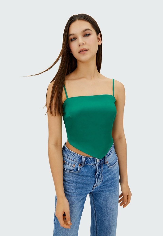 İnce askılı, yeşil parlak kumaştan yapılmış, normal midi boyda, sokak stiline uygun, şık ve rahat bir büstiyer.