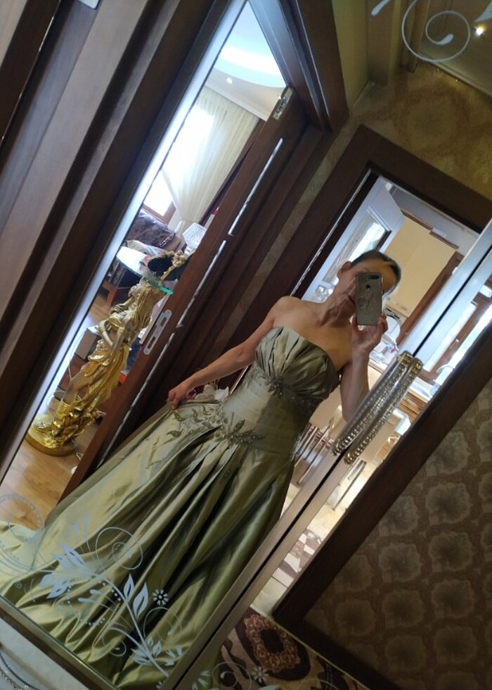 Yeşil saten straplez işlemeli kuyruklu 38 beden kuyruklu tuvale