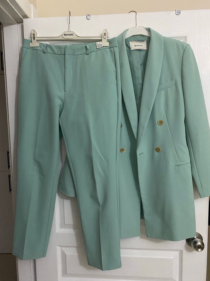 Pastel yeşil renkli, saten dokulu kadın blazer ve pantolon takımı, yakalı ve düğmeli detaylarla ofis için şık ve rahat bir tercih.