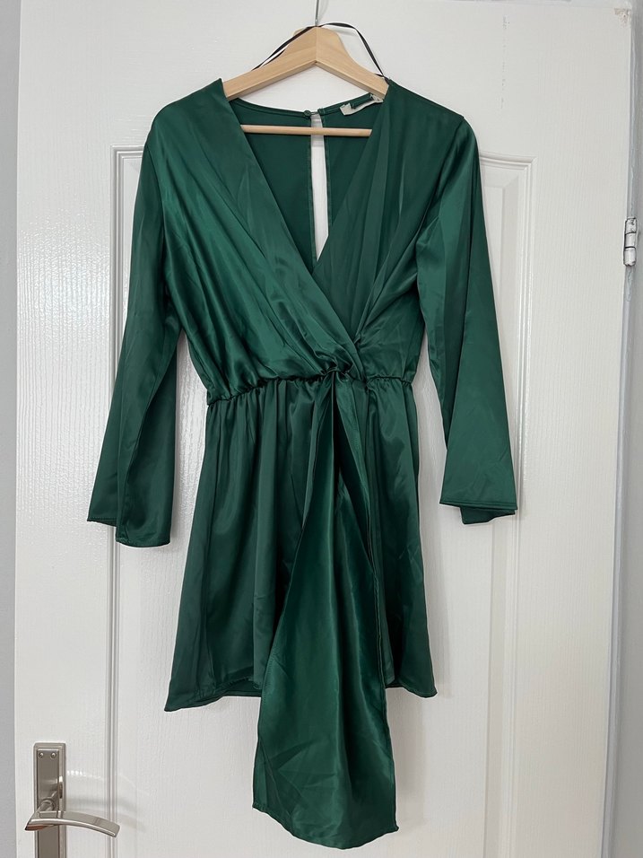 Yeşil renkte, drapeli ve V yakalı uzun kollu Saten tulum hiç giyilmedi defosuz omuzdan boy 81 cm beli ayarlanabiliyor L beden ama m-l uyumlu