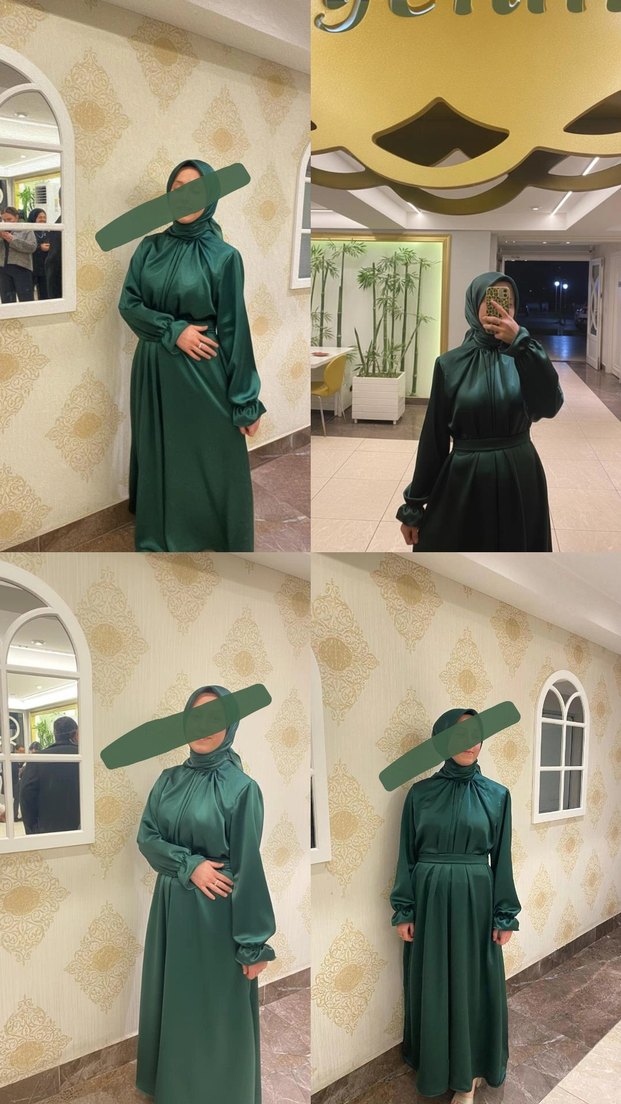 Gevşek kesim, uzun kollu, yüksek yakalı ve drapeli detaylara sahip koyu yeşil saten elbise, mütevazı ve avangart bohem tarzını yansıtıyor. eşarp dahil (kendim diktim)