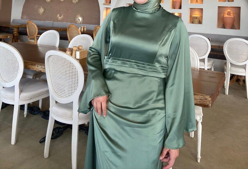 Yeşil Saten Uzun Drapeli Kadın Elbise