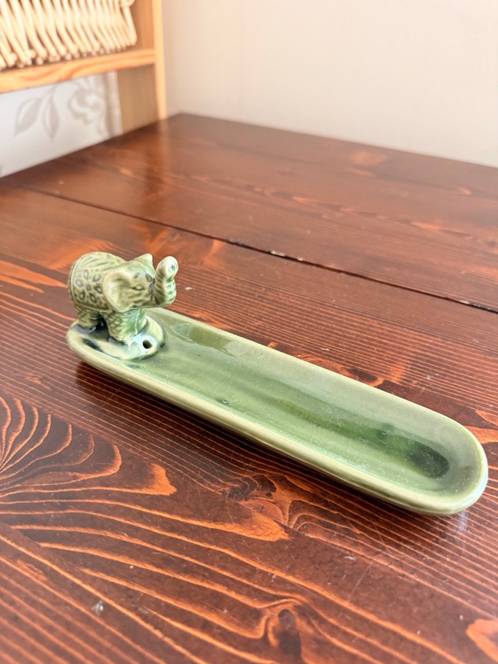 Yeşil seramikten yapılmış, detaylı Fil figürlü dekoratif tabak. Küçük eşyalar veya tütsü için uygundur.