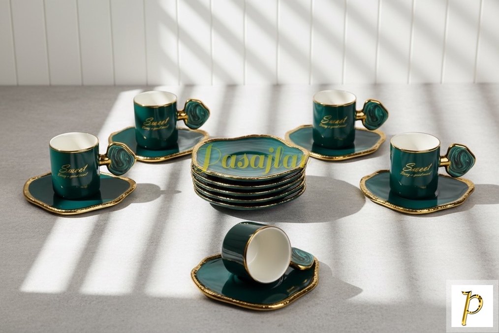 Koyu yeşil seramik kahve fincanları ve altlıkları, altın renkli kenarlarla ve üzerinde "asajla" yazısı ile. Set, özel kulplar ve tabaklar içerir. ☕
