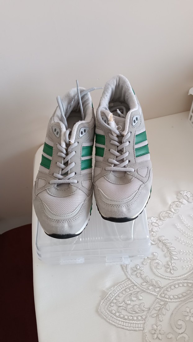 Gri tabanlı, yeşil şeritli ve bağcıklı kadın spor ayakkabısı. İnce topuklu ve kauçuk tabanlı, spor ve sokak giyimine uygun. sorunlu yerleri görselde mevcut