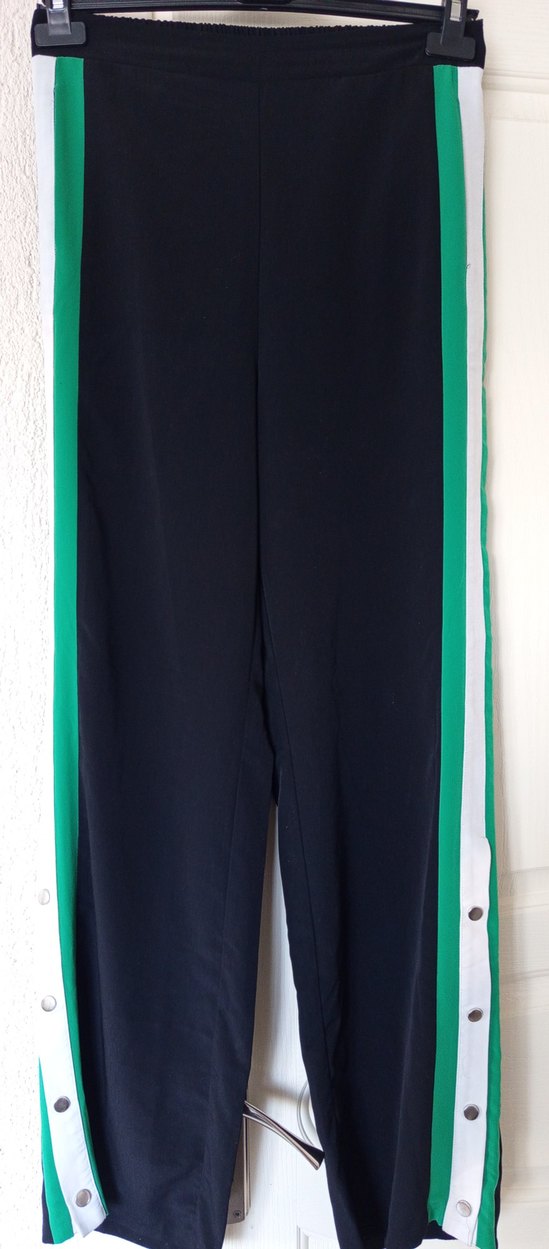 Rahat kesim kadın kumaş pantolon, koyu renk taban üzerine yeşil yan şeritler ve yırtmaç detayına sahip, pürüzsüz sentetik kumaştan üretilmiştir.