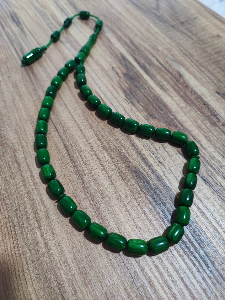 Yeşil renkli, minimalist tarzda sıkma kehribar erkek tesbih. Canlı ve renkli boncuklara sahip.