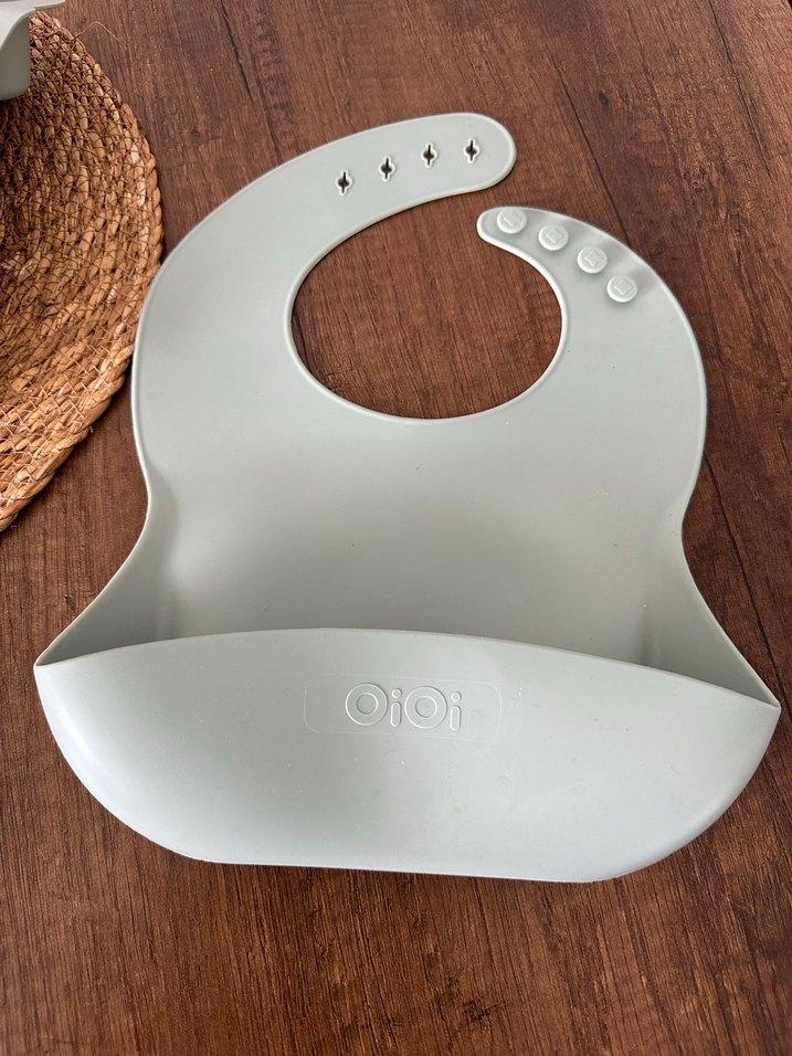 Yeşil silikon bebek mama önlüğü, ayarlanabilir düğmeli boyun kısmı ve geniş yiyecek toplama cebine sahiptir. Temizlemesi kolaydır. Orjinal oioi marka