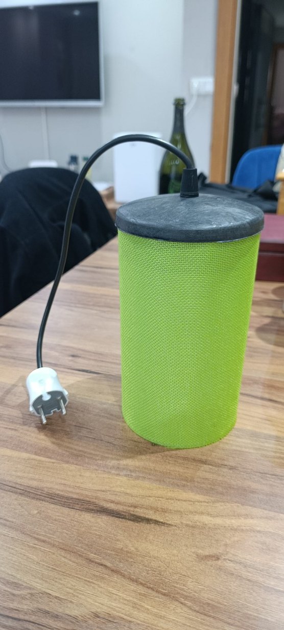 Yeşil silindirik kumaş abajur, siyah üst kısmı ve güç kablosu ile birlikte gelir. Renkli bir aydınlatma aksesuarıdır.