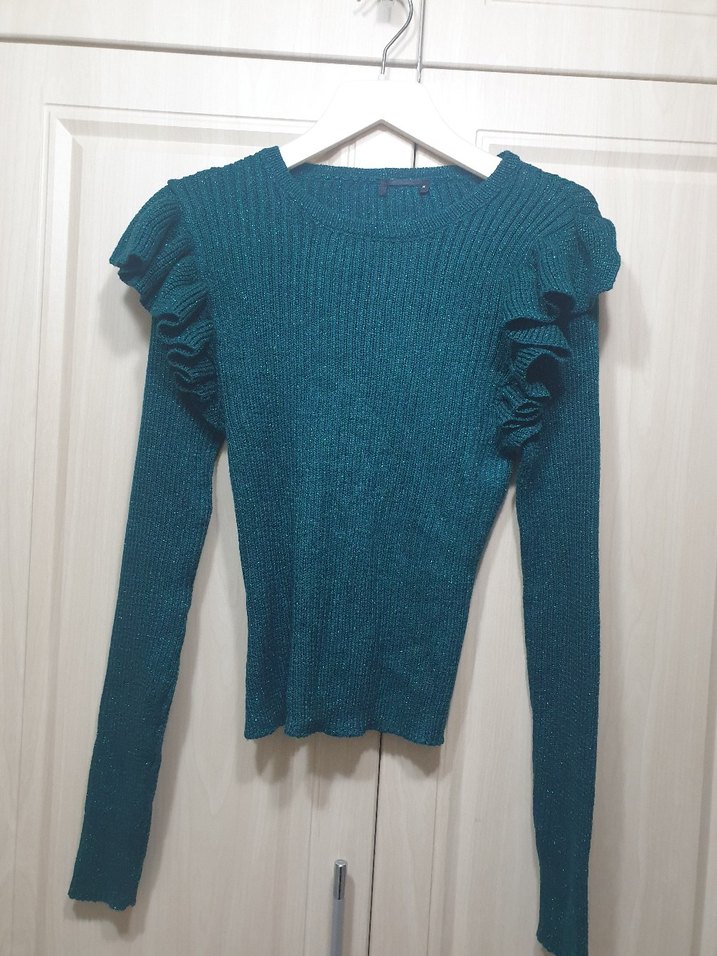 Simli yeşil renkli, uzun kollu ve kruvaze yaka, triko kumaştan yapılmış, vücuda oturan kadın kazak. Sokak stiline uygun, rahat ve günlük kullanıma ideal. Arkası yarı açık ve bağlamalıdır,hem gömlekle hem sade kombinlenebilir