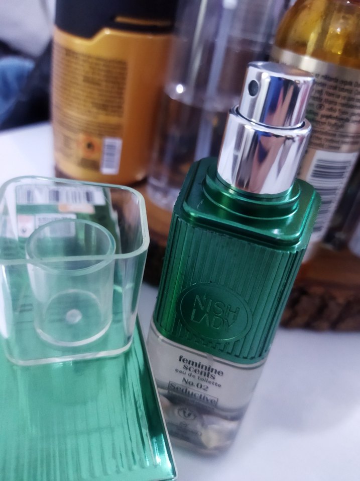 Kadın parfümü, yeşil cam şişede ve gümüş sprey başlıkla sunuluyor. Feminen, taze kokulu No. 02 etiketli parfüm.