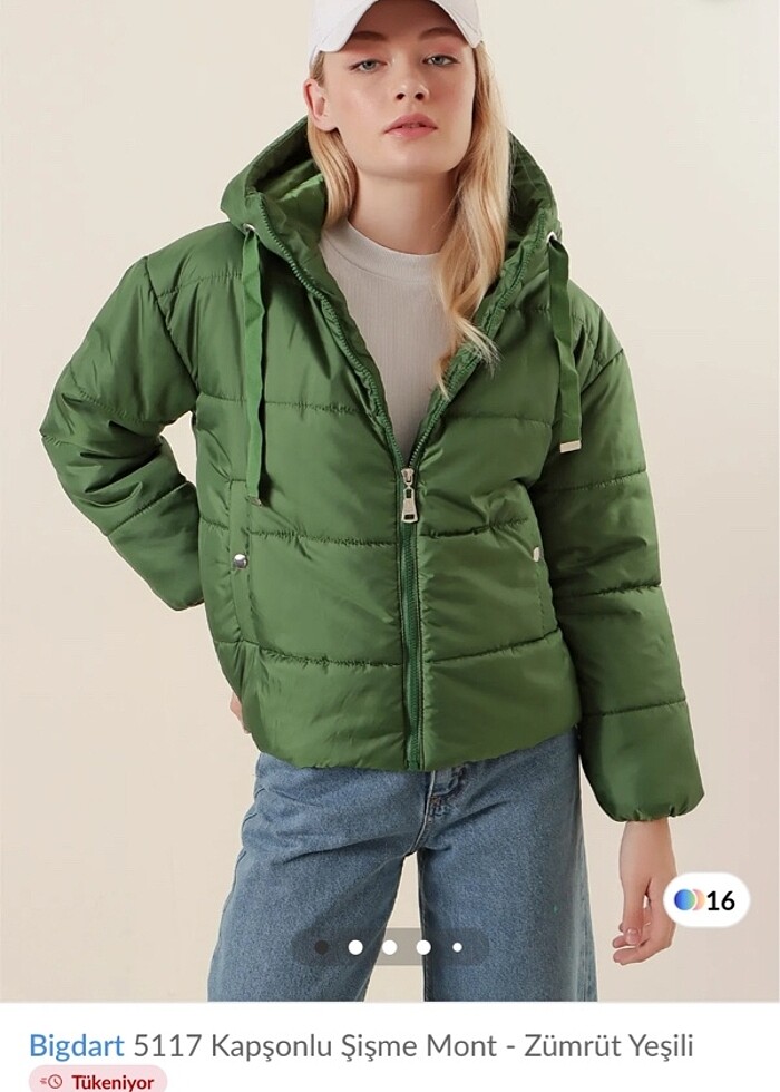 Yeşil şişme mont Ürünün rengi görseldekinden biraz daha açık duruyor. Son fotoğraftaki gibi rengi. Model olarak aynısı