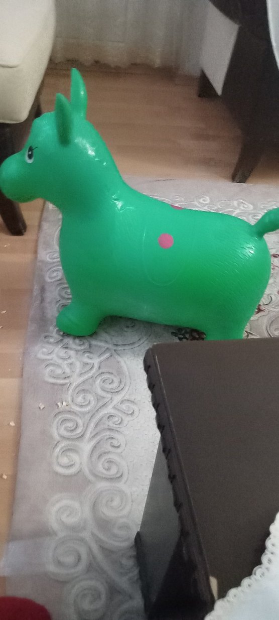 Yeşil renkte, şişme oyuncak at, renkli detaylara sahip ve oyun için uygundur. Hafif ve kullanımı kolaydır.
