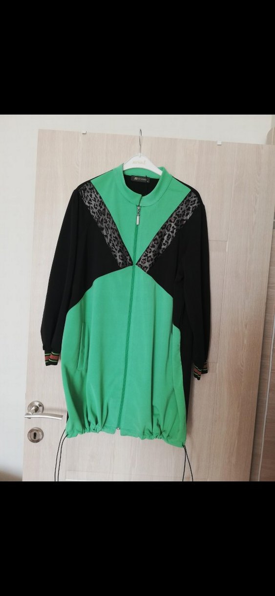 Uzun kollu, yuvarlak yakalı, bol kesim kadın ceketi. Sentetik kumaştan üretilmiş, koyu yeşil ve siyah renkte baskılı desenlere sahip, fermuarlı ön kısmı var. Günlük kullanım için uygun, athleisure tarzında.