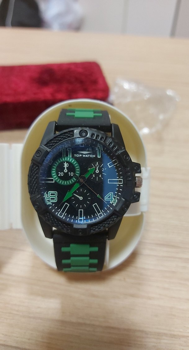 Yeşil ve siyah renklerde, biker tarzı erkek kol saati. Yuvarlak kadran ve belirgin işaretçilerle sokak stiline uygun dayanıklı kayış içerir. ⌚