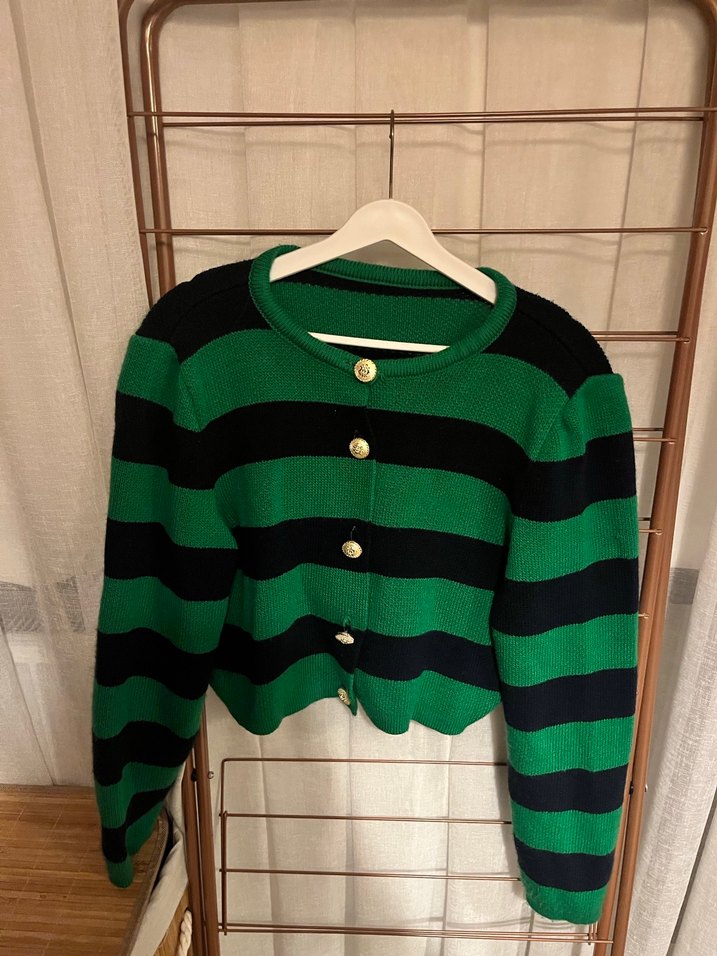 Marka hatırlamıyorum. Yeşil ve siyah çizgili, yuvarlak yakalı ve uzun kollu triko hırka. Rahat kesimli, vintage Paris tarzında, günlük kullanım için uygundur.