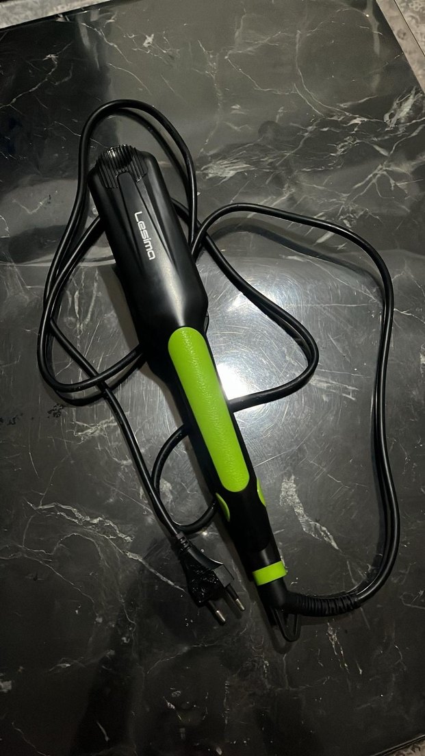 Uzun kablolu, koyu yeşil siyah tasarıma sahip saç düzleştirici, saçları düzgün ve pürüzsüz yapar.