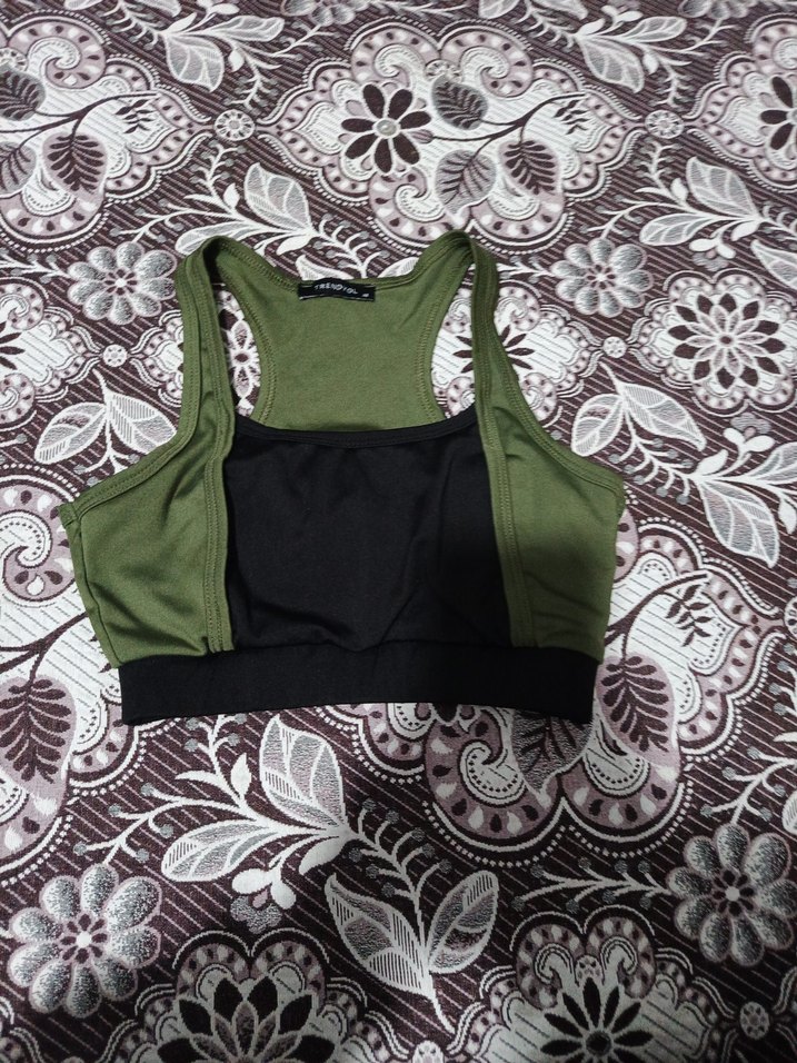 Yeşil ve siyah renklerde, sentetik kumaştan yapılmış, kolsuz ve straplez, dantel detaylı kısa kesim spor crop