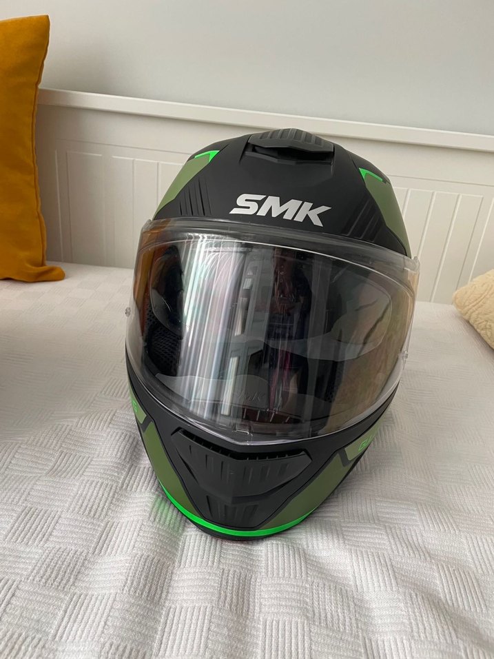 Koyu yeşil SMK motosiklet kaskı, baskılı desenli ve tokalıdır. Minimalist biker tarzı ve rock punk havası yansıtır. UNİSEX, hem kadın hem erkek içindir